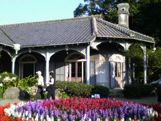 「グラバー園のグラバー邸。建物も綺麗ですし、その中に展示されていた食事会の様子も豪奢でしたし、前の花壇も綺麗ですし。