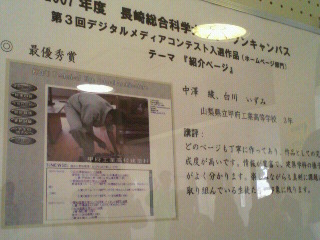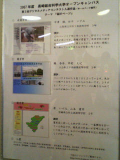 「さて、長崎総合科学大学に到着しました。こちらの写真はホームページ部門の最優秀賞から優秀賞までの写真が飾られています。